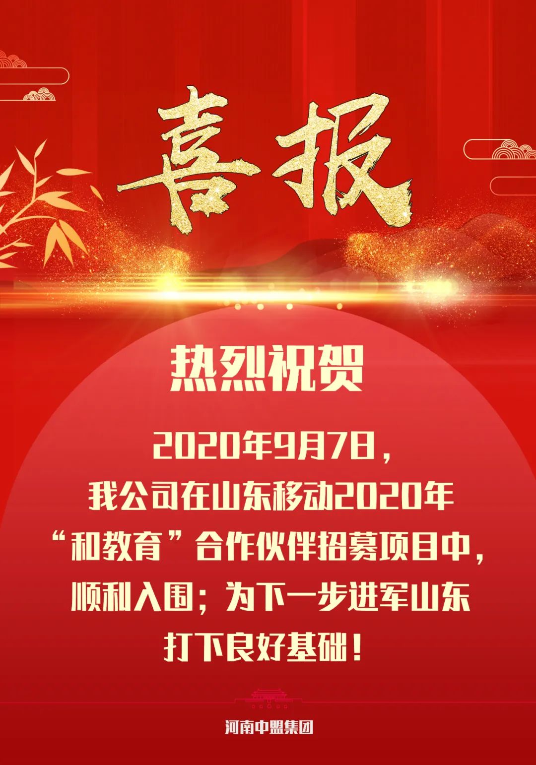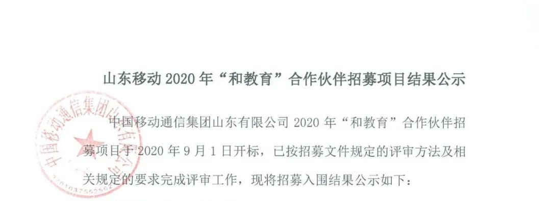 2020年9月7日,我公司在山東移動“和教育”合作伙伴招募項目中,憑借過硬的產(chǎn)品質(zhì)量,扎實高效的工作作風(fēng),卓越的運作團隊和良好的商業(yè)信譽,順利入圍。